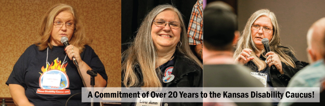 The Kansas Disability Caucus has been around for 37 years and has made a tremendous impact on people in our state and on advocacy for the Kansas disability community. The Caucus has had various leaders at the helm over the years, and we would like to recognize one of the most dedicated. Lou Ann Kibbee has been involved with Caucus planning since 2003 and served as the Caucus Chairperson for the last 8 years. Lou Ann has served her limit of terms and ended her time on the Caucus Board at the end of 2024. We wanted to take the chance to thank her so much for helping make the Caucus what it is today!
